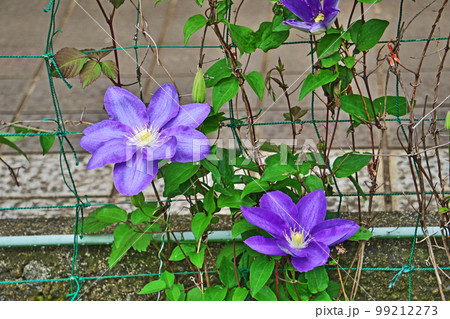 フェンスのネットに絡みつく蕾のついたクレマチス