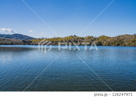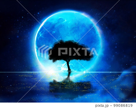 水面に浮かぶ大きな青い満月に照らされた大樹の影のシルエットのファンタジー風景背景イラスト