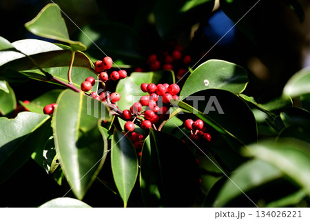 鮮やかな赤いクロガネモチの実(秋、十月)