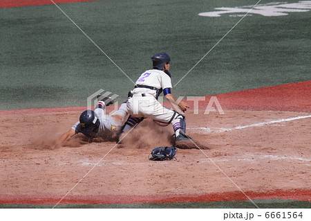 高校野球の試合で本塁へヘッドスライディングしてくる選手と捕手
