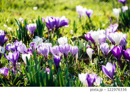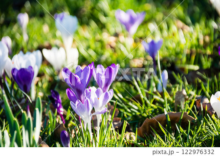 Spring beautiful crocus flowers blooming in a park in sunlight.