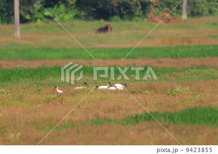 2月のスリランカの稲刈り間近な稲田に集まるクロトキとダイサギ