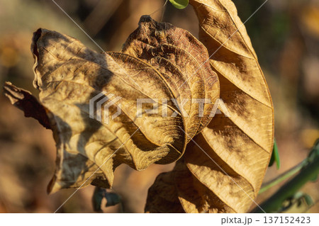 冬の森 日差しに輝く枯葉のクローズアップ04