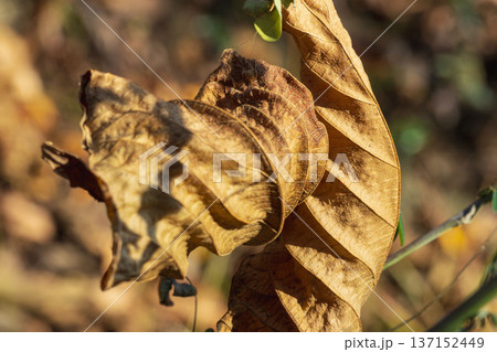 冬の森 日差しに輝く枯葉のクローズアップ03