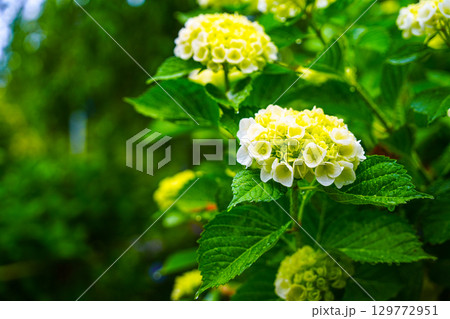 大自然の森に映える美しい赤いアジサイの花 (コピースペース素材)