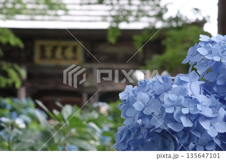 寺院を背景に咲く青い紫陽花の花