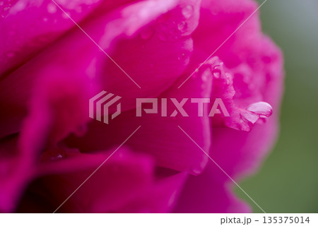ピンク色の芍薬の花のクローズアップ写真です。花びらに水滴があります。