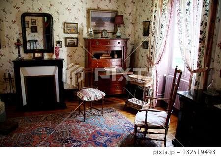 フランス・ジヴェルニー モネの家 花柄のファブリックに包まれた温かみのあるモネの寝室