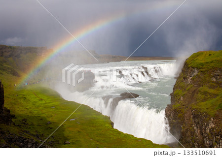 北欧の島国アイスランド クヴィータアゥ川から流れ落ちる黄金の滝を意味するグトルフォスと虹