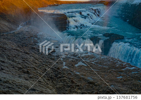 グトルフォスの滝と朝焼け