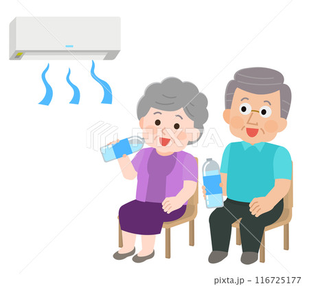 涼しく過ごせる場所で水をのむ高齢者 イラスト
