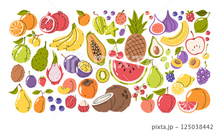 Colorful Hand-Drawn Fruit Collection with Exotic and Tropical Fruits in a Modern Flat Style.