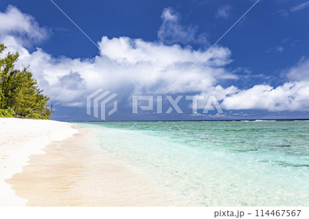 南国のビーチ 快晴の青空とヤシの木
