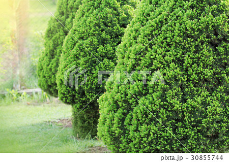 White spruce decorating glowing Chrismas lights garland on town street. Picea glauca Conica dwarf decorative tree