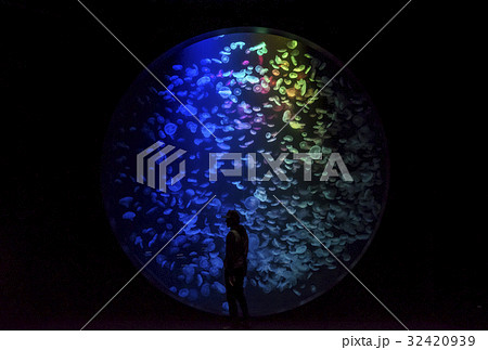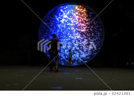 クラゲ水族館 円水槽 加茂水族館 水槽のクラゲを見る人 イメージ素材 山形観光スポット