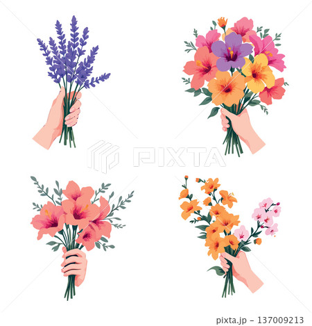 Hands holding lavender, hibiscus, gladiolus and lily of the valley bouquets