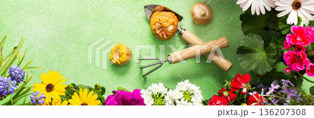 A vibrant balcony is decorated with various spring flowers in full bloom. Gardening tools are placed among the flowers, highlighting a fresh and lively spring ambiance, banner