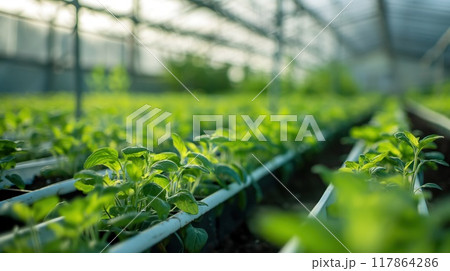 plants growing in greenhouse on a sunny day. Sustainable agriculture concept.