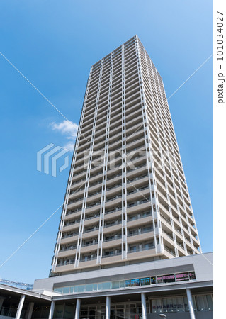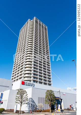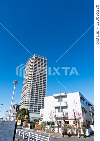 国領駅前でタワーマンションを見上げる 冬晴れの青空 東京都調布市国領町