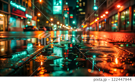 Close-up of wet asphalt road in a city at night reflected of colorful lights from buildings and streetlamps. Created with Generative AI.