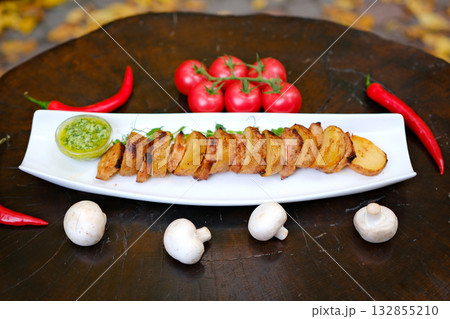 Bowl of tasty potato salad with dill, mushrooms, tomatoes and salt background