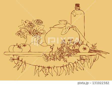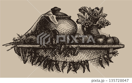 Watercolor composition from a set of vegetables: pumpkin, eggplant, onion, beets, peppers, radishes, dill, carrots, peas, potatoes, parsley, spinach, watercolor. The illustration is drawn by hand.