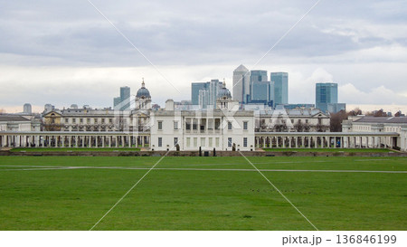 ロンドン・グリニッジ公園から望む旧王立海軍学校とカナリー・ワーフの高層ビル群