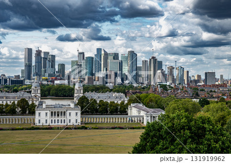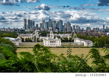 View of Greenwich Park with the Naval College and the City, London, UK.