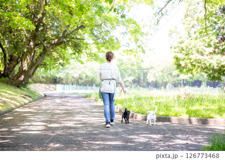犬を散歩させる日本人女性の後ろ姿