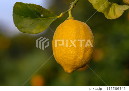 Yellow citrus lemon fruits and green leaves in the garden. Citrus lemon growing on a tree branch close-up.5