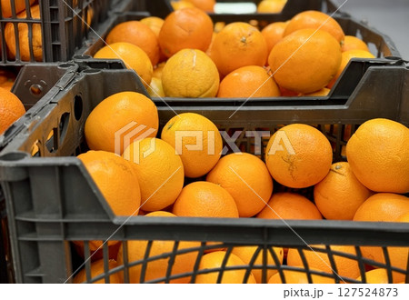Ripe fresh organic oranges in box on the shelf of a fruit supermarket are displayed for sale. Close-up