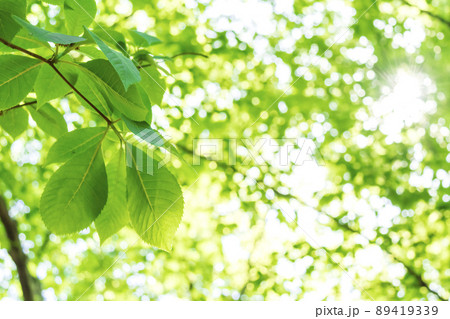 日本の植物風景 太陽光とハクモクレンの新緑。エコロジー、高潔な心、自然への愛などのイメージ…=横浜