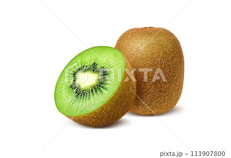 Kiwi fruit with cut in half isolated on white background. Standing kiwi and a slice with clipping path.
