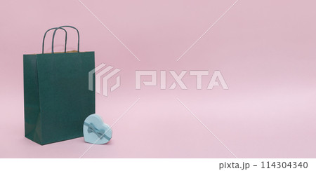 Shopping bag with heart shaped gift box on pink background. Copy space, holiday concept. High quality photo