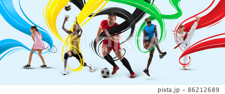 Sport collage. Professional sportsmen in action isolated on white background with blue, yellow, black, green and red stripes, lines.