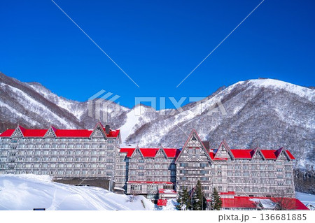 夕方のスキー場から見下ろす赤い屋根のホテルと盆地へと続く眺望 (新潟県、南魚沼、上越国際スキー場)