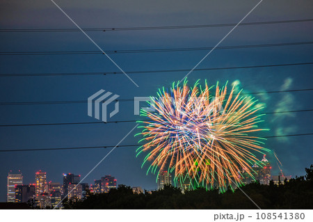 日本の東京都市景観4年ぶり多摩川花火大会。第45回世田谷区たまがわ花火大会の会場側・奥に都庁=21日