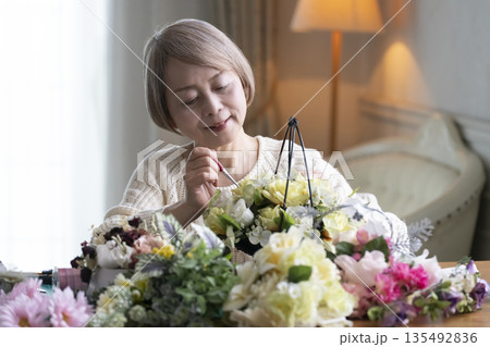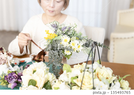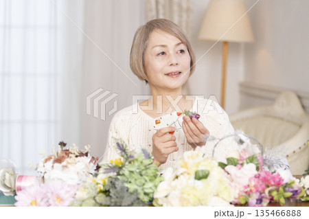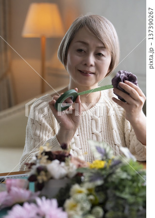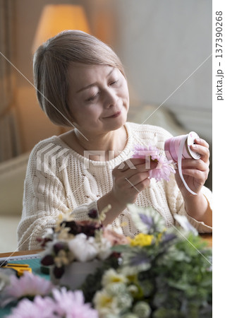リビングで趣味のフラワーアレンジメントをするシニア女性