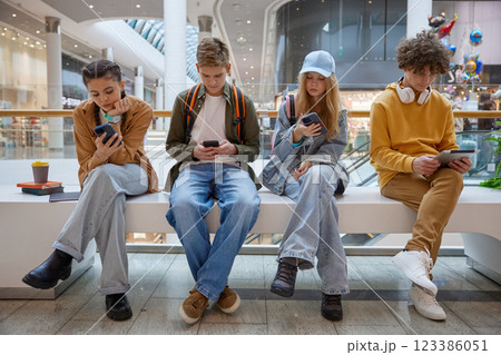 Group of teenagers using mobile gadgets visiting big city shopping center