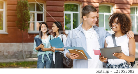 College Romance. Portrait of smiling male student cuddling his african american girlfriend outdoors during break in classes