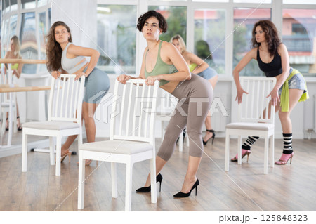 Group of energetic teenage dancers focused on training together in spacious dance hall
