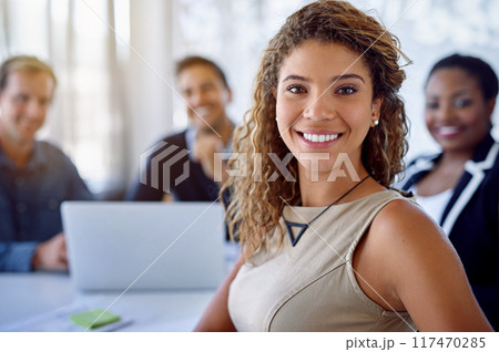 Meeting, proud and face of woman, happy and project for teamwork in boardroom, laptop and confident in company. Business, auditor and person with smile in work, professional and portrait of employee