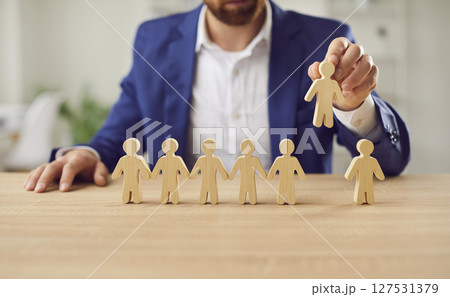 Recruiter takes one out of several identical human figures illustrating recruitment concept