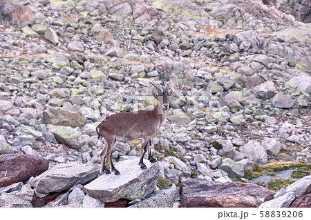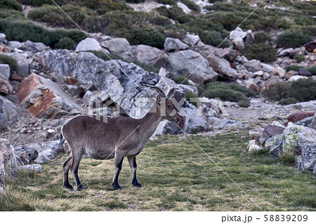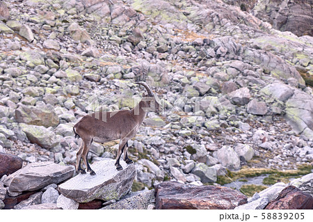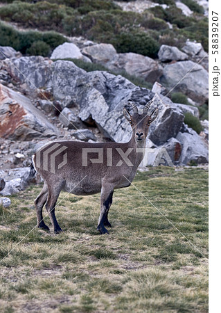 Alpine ibex or Capra pyrenaica on the summit of the mountain against stones in Sierra de Gredos mountain range. Avila, Spain