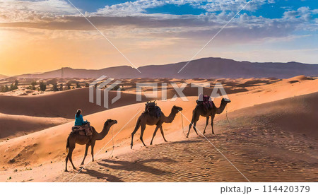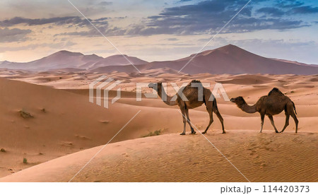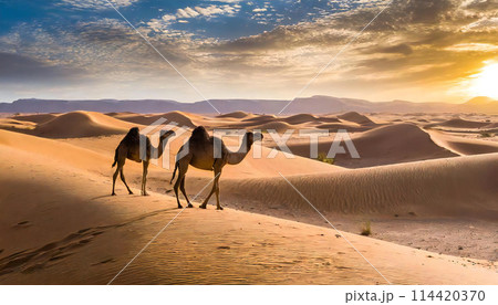 砂漠の中を歩くラクダのイメージ素材