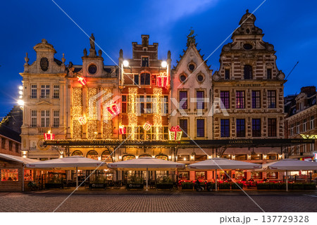 ベルギー・ルーヴェンのグローテ・マルクト イルミネーションで彩られた歴史的建造物と夜のテラス