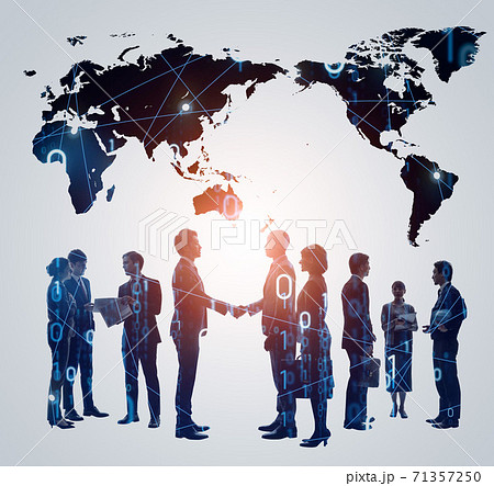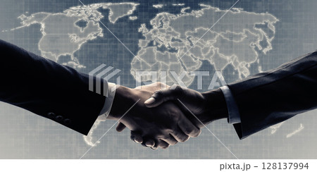 グローバルビジネスイメージ 握手するビジネスパーソン パートナーシップ 世界地図