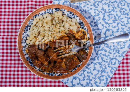Hungarian goulash with spaetzle on checkered tablecloth: delicious traditional stew
