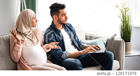 Mood Changes During Pregnancy. Annoyed pregnant muslim woman looking at husband that spending time with laptop and ignoring wife, middle eastern family suffering conflicts while awaiting baby