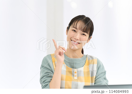 パソコン作業で良いことを思いつくエプロンを着た女性